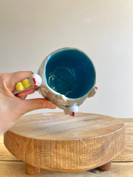 Handmade with lots and lots of love from stoneware clay (so it’s nice and strong) and fired twice with the highest quality underglaze paints and a high gloss clear glaze. This process from wet clay to finished product takes weeks and each piece is unique and there is no other out there like it!