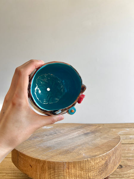 Handmade with lots and lots of love from stoneware clay (so it’s nice and strong) and fired twice with the highest quality underglaze paints and a high gloss clear glaze. This process from wet clay to finished product takes weeks and each piece is unique and there is no other out there like it!