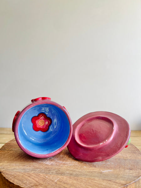 handmade with lots and lots of love from stoneware clay (so it’s nice and strong) and fired twice with the highest quality underglaze paints and a high gloss clear glaze. This process from wet clay to finished product takes weeks and each piece is unique and there is no other out there like it!